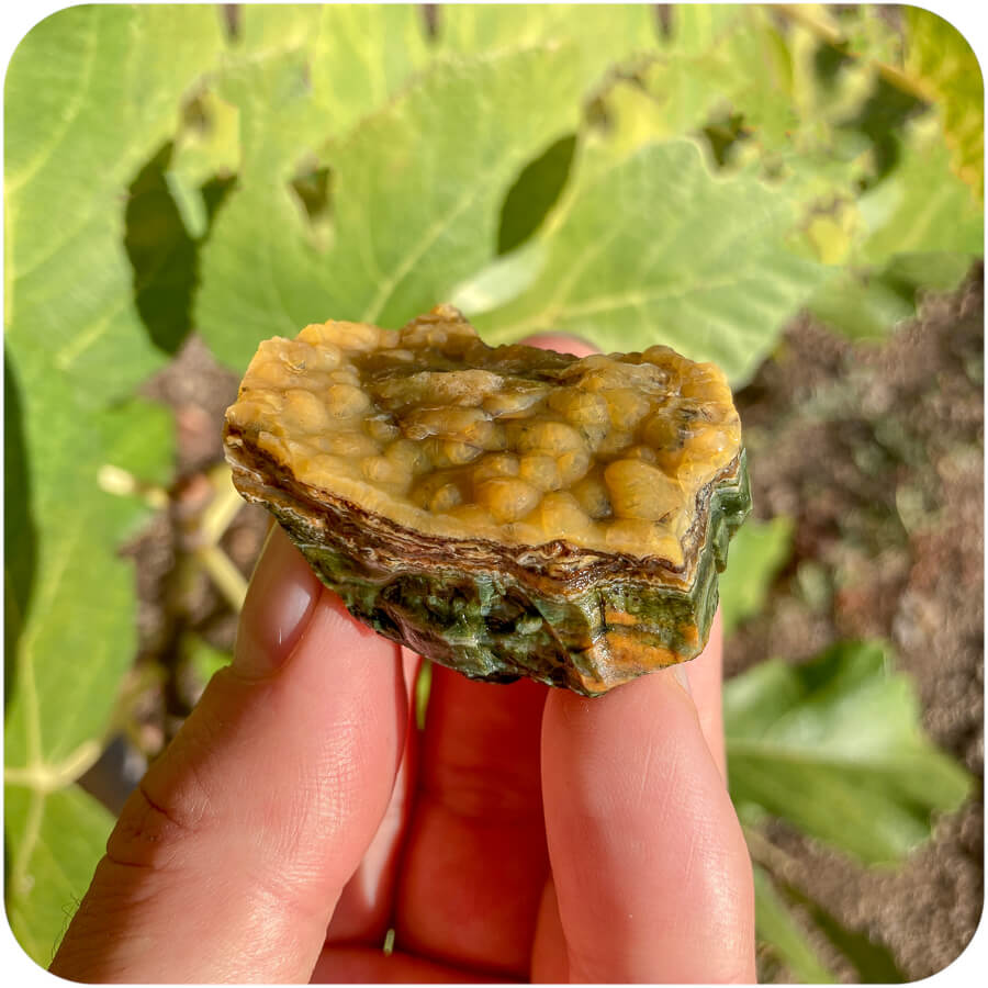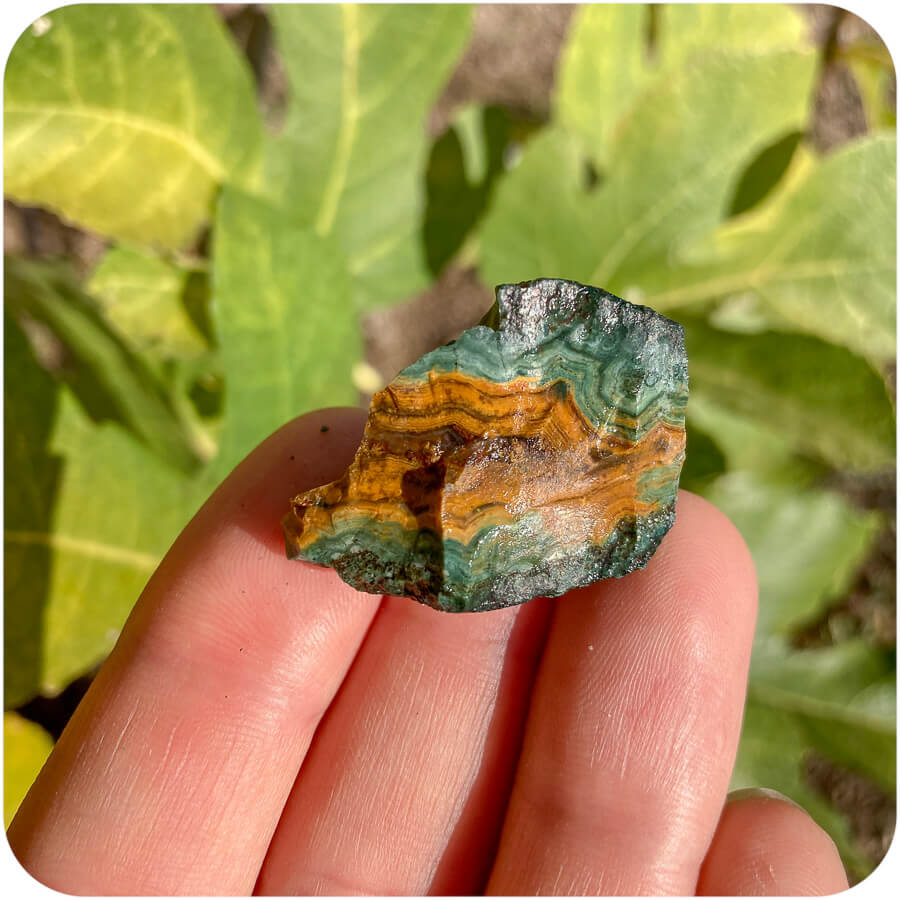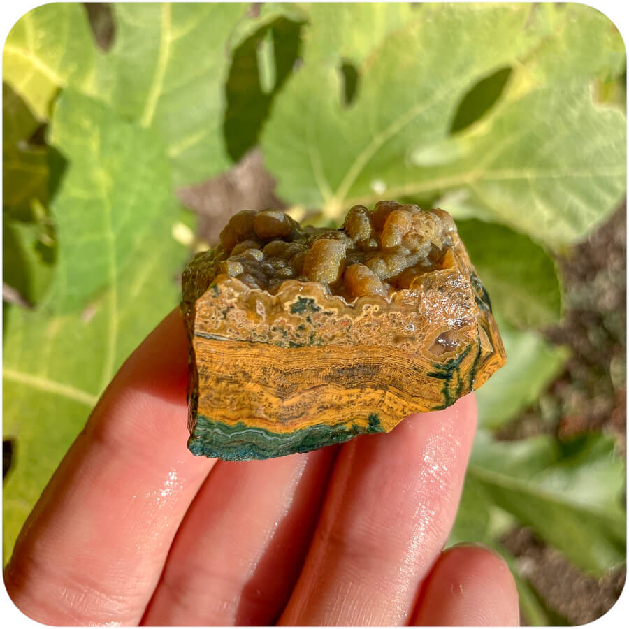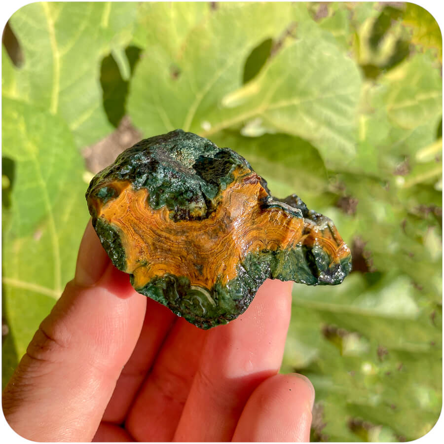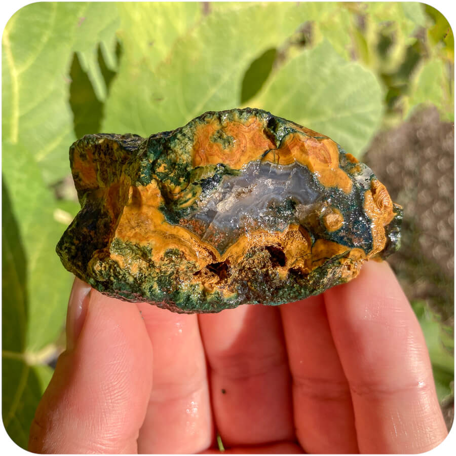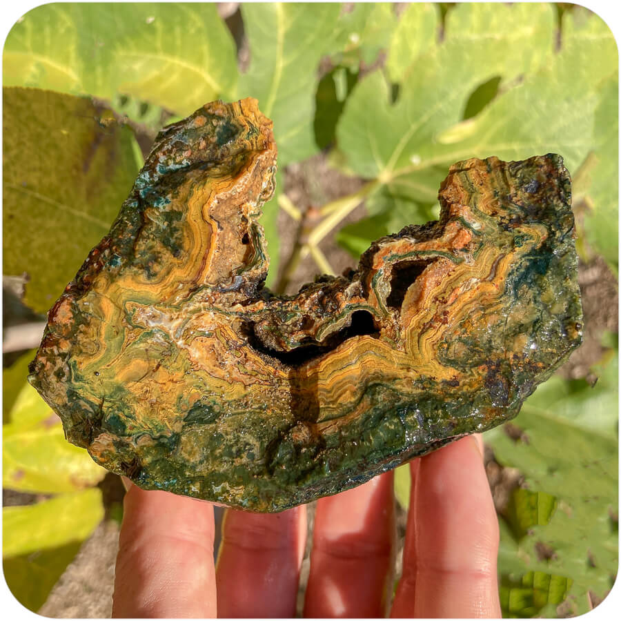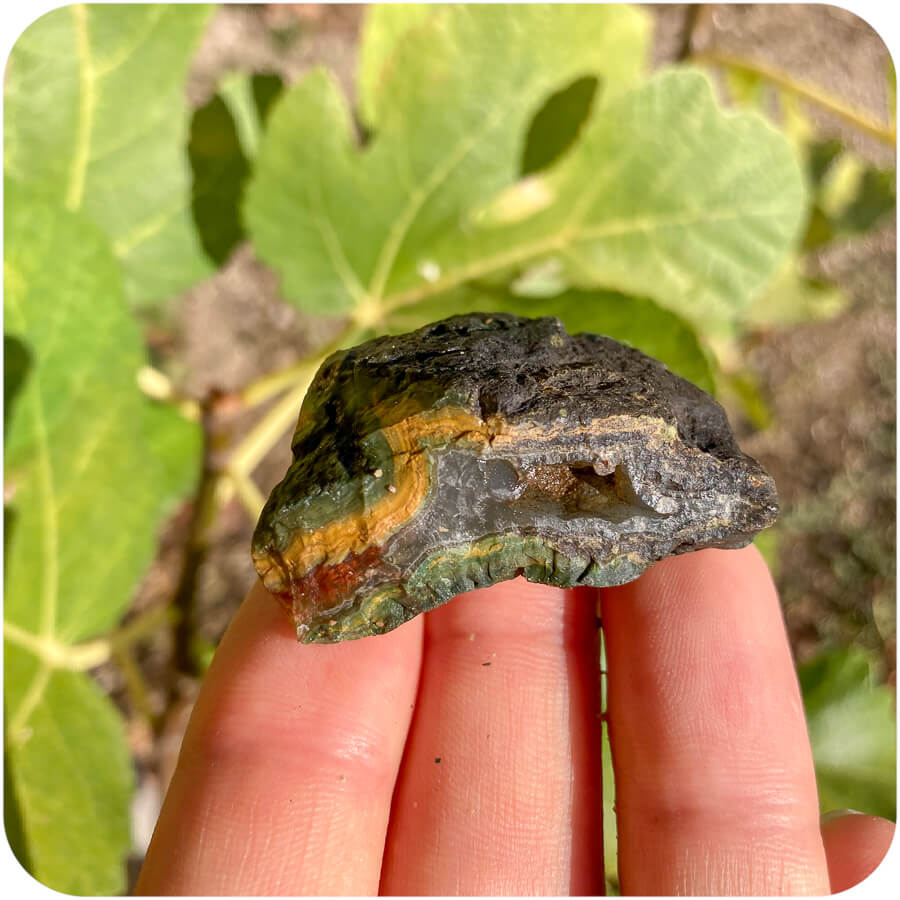 Agatul este, de obicei, format din benzi de celadonit verde și jasp galben/portocaliu/maroniu, cu buzunare și/sau centre de calcedonie transparentă până la albă. 🌍
