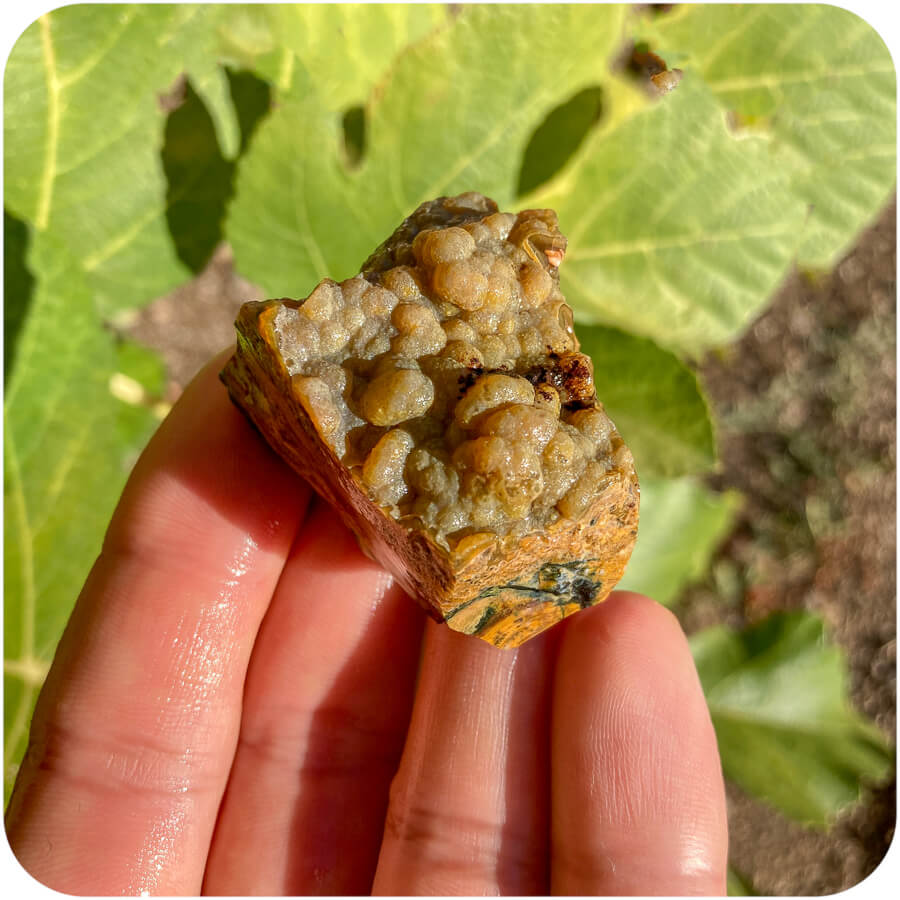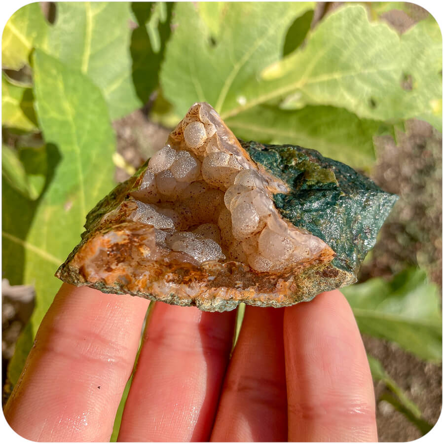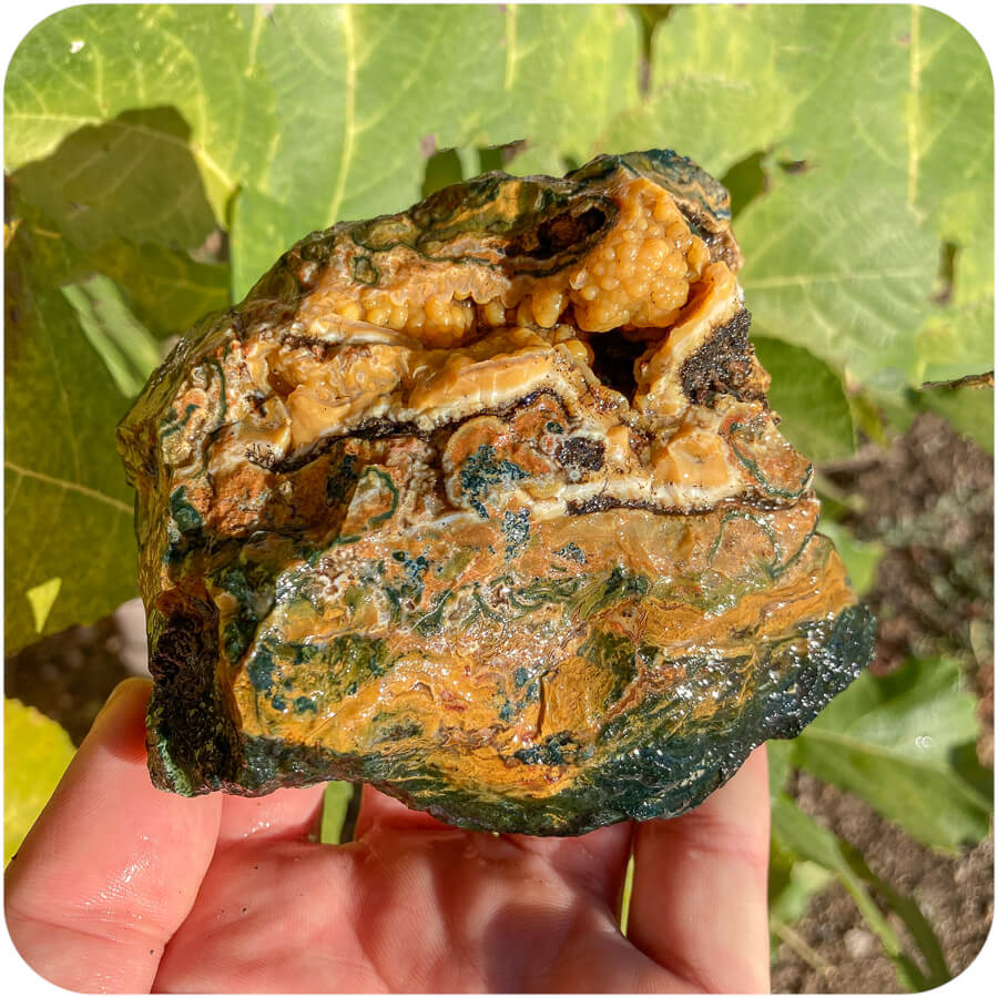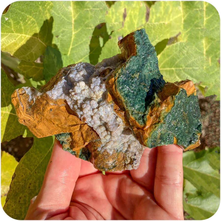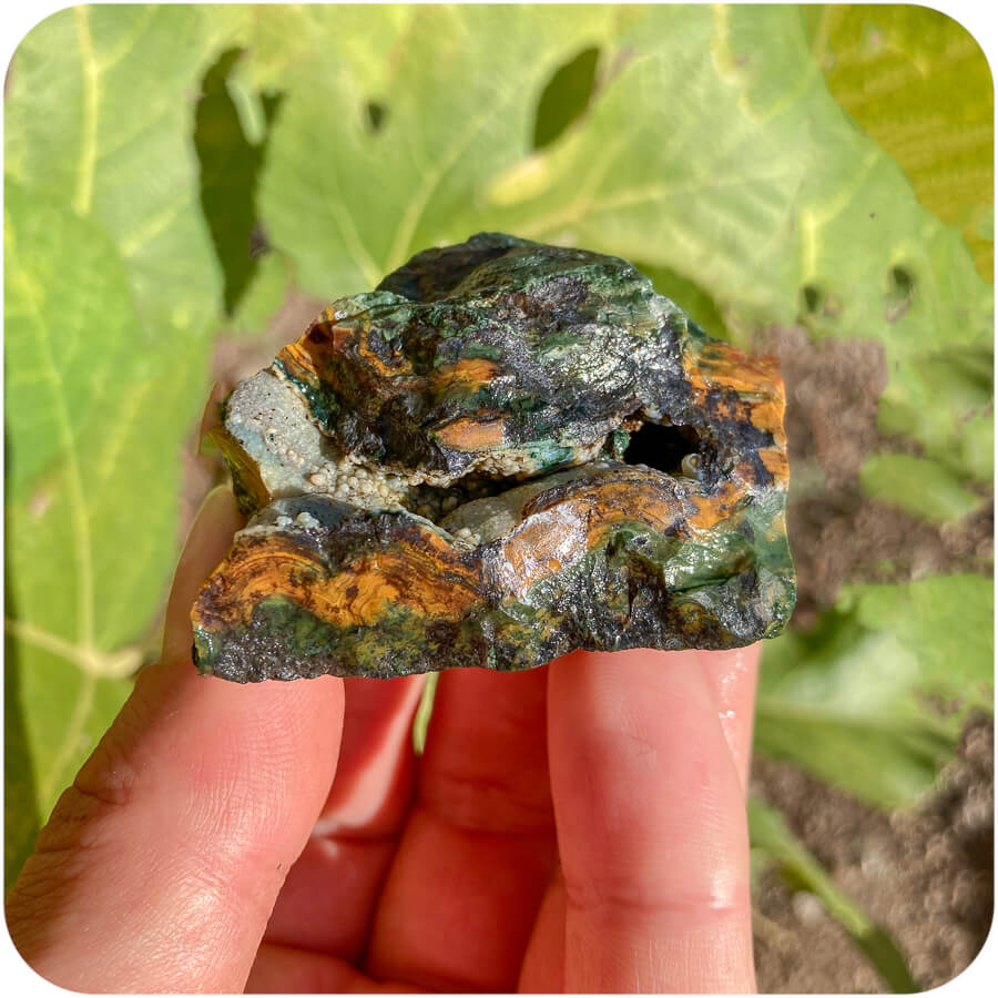 Calcedonia poate conține agate de mușchi dendritice (verde) sau incluziuni ca niște umbre colorate (portocaliu/auriu/roșu). 🍁
