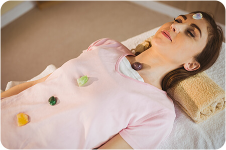 De exemplu, așezați un ametist pe cap pentru chakra coroanei și mergeți în jos cu pietrele corespunzătoare fiecărui centru energetic.