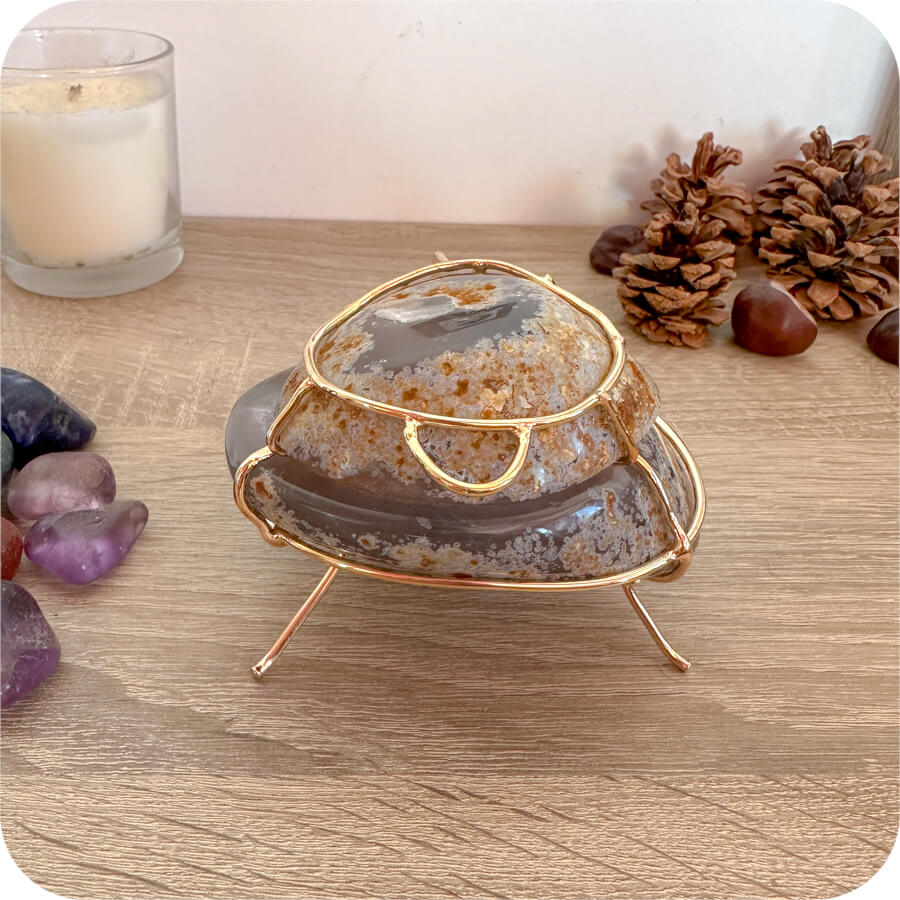 Această cutie rafinată nu este doar practică, ci și o operă de artă unică. Realizată din agat natural, atrage atenția prin textura și nuanțele sale delicate de culoare. Agatul este cunoscut ca piatră a stabilității și protecției, fiind ideal pentru păstrarea comorilor tale prețioase.