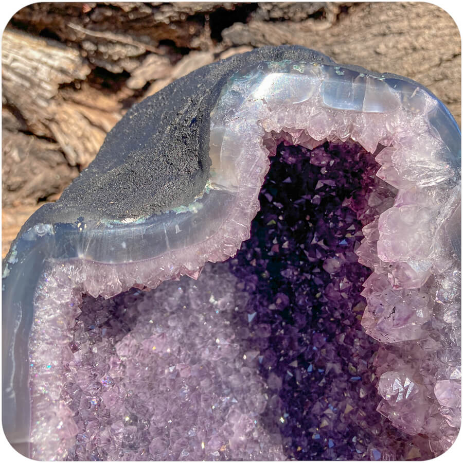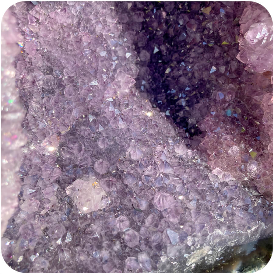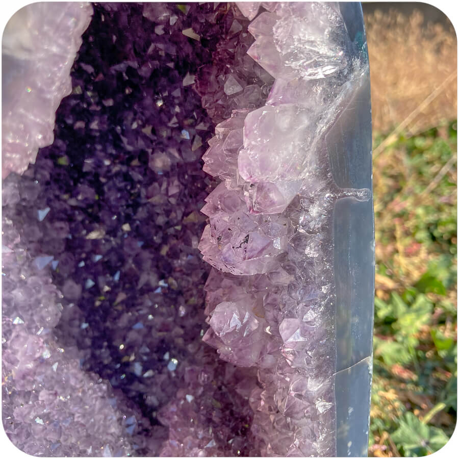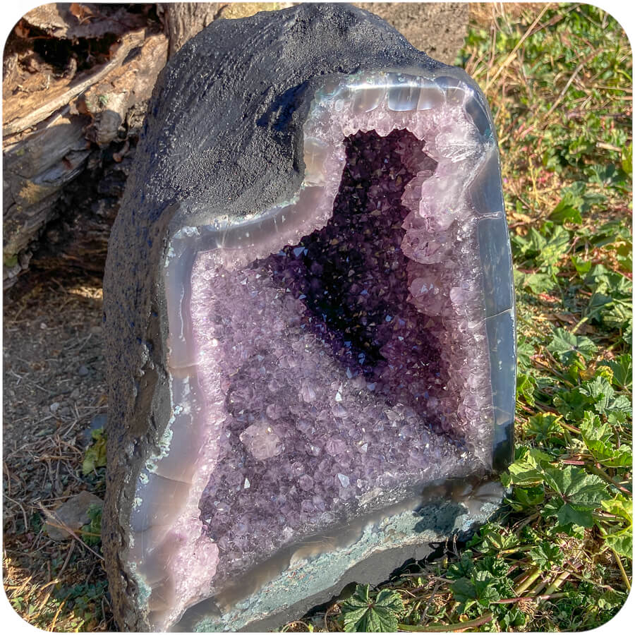 Geoda de ametist este o piatră goală cu cristale de ametist pe pereții interiori. Suprafața interioară se numește druză, care este un cuvânt folosit pentru a descrie un strat natural de cristale format pe corpul unui mineral. 💎