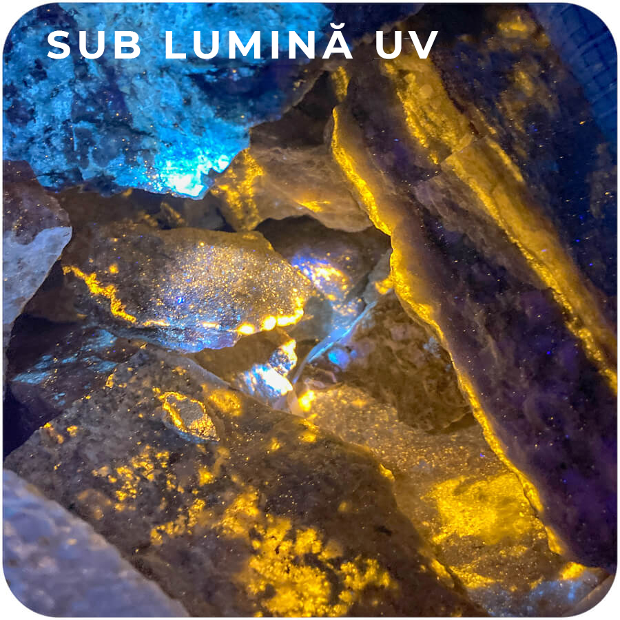 O bucată de rocă aparent obișnuită – dar privită prin lumina unei lanterne UV, această piatră își transformă exteriorul umil într-o strălucire galbenă strălucitoare. 🌟