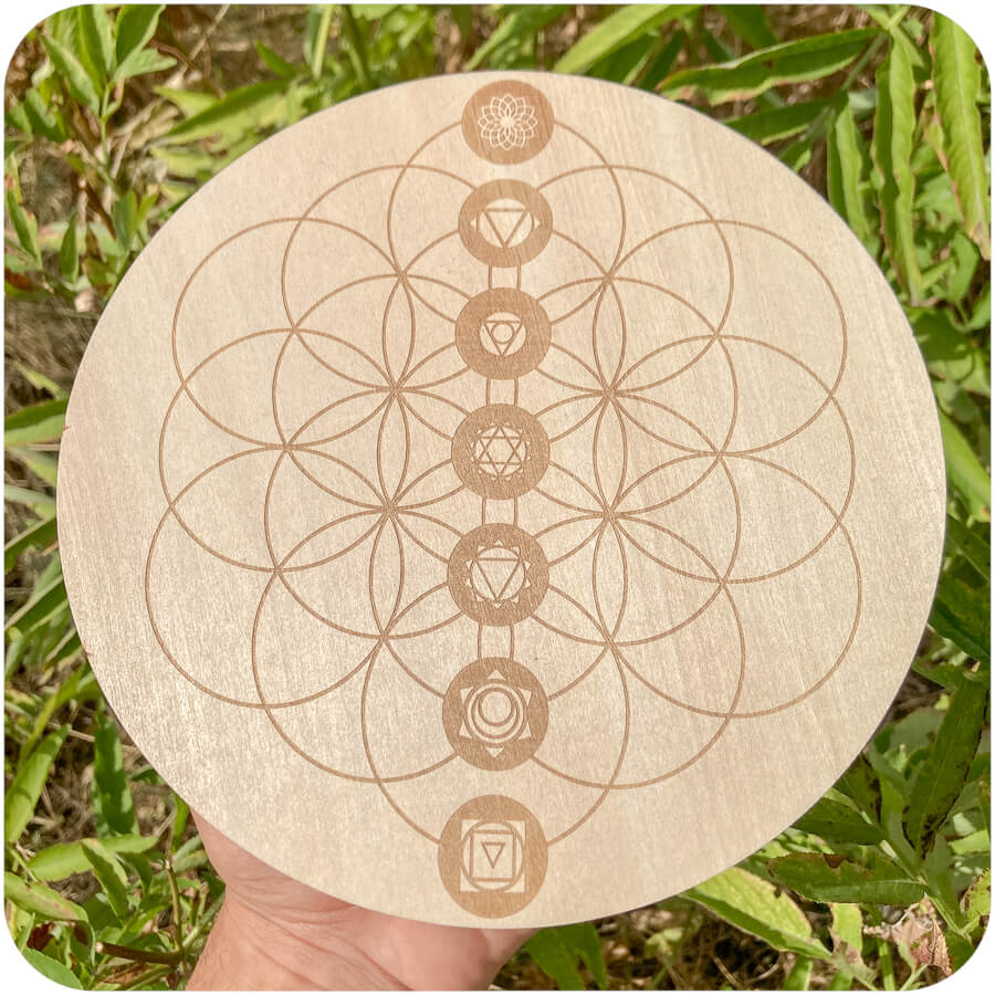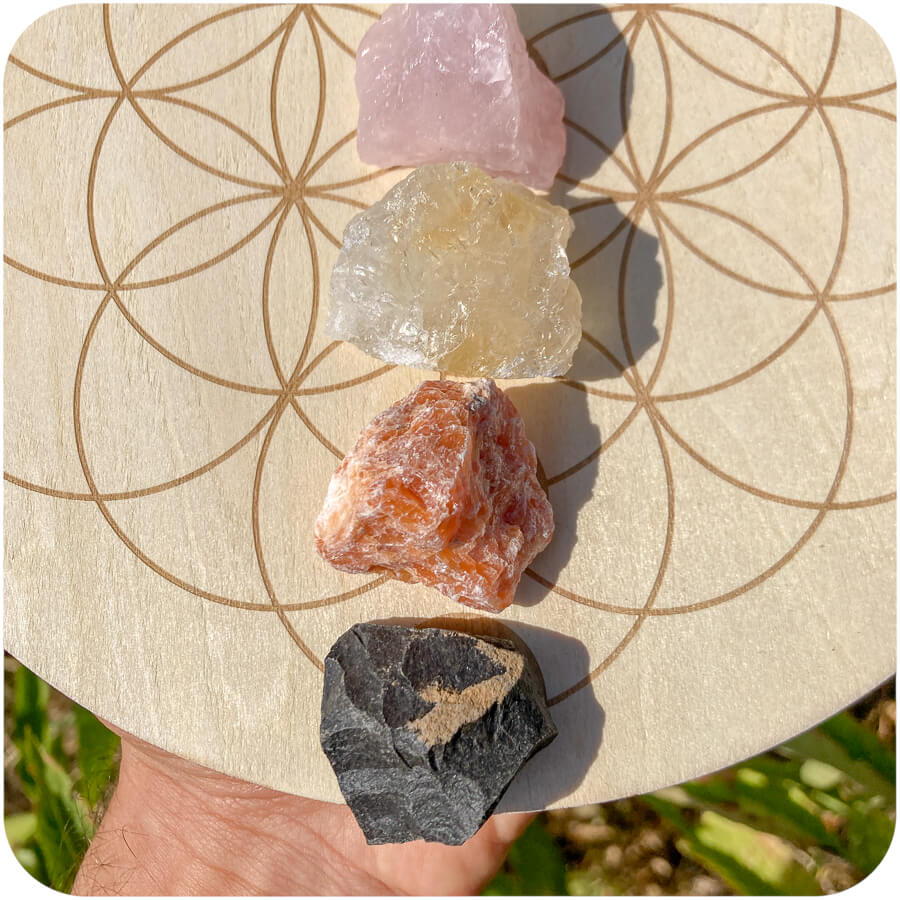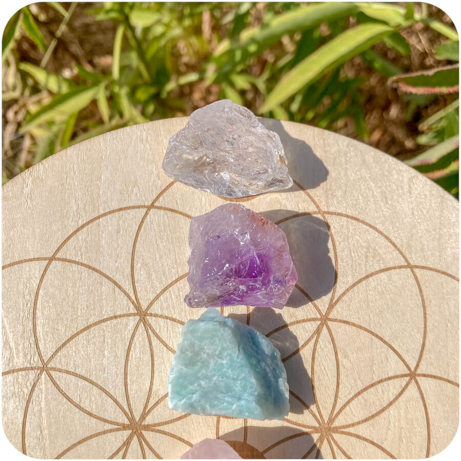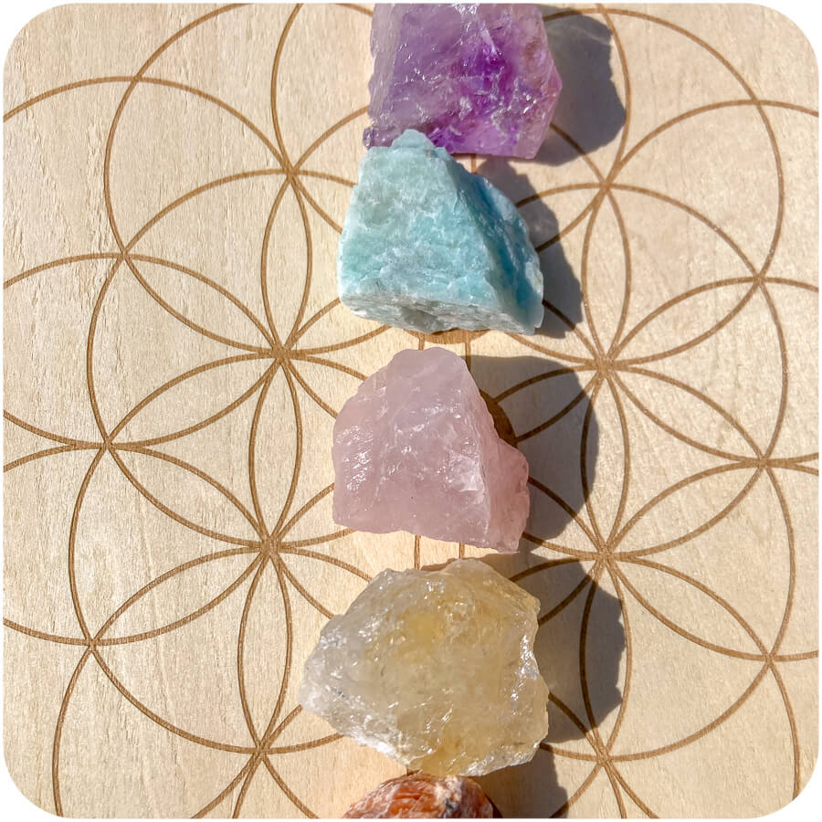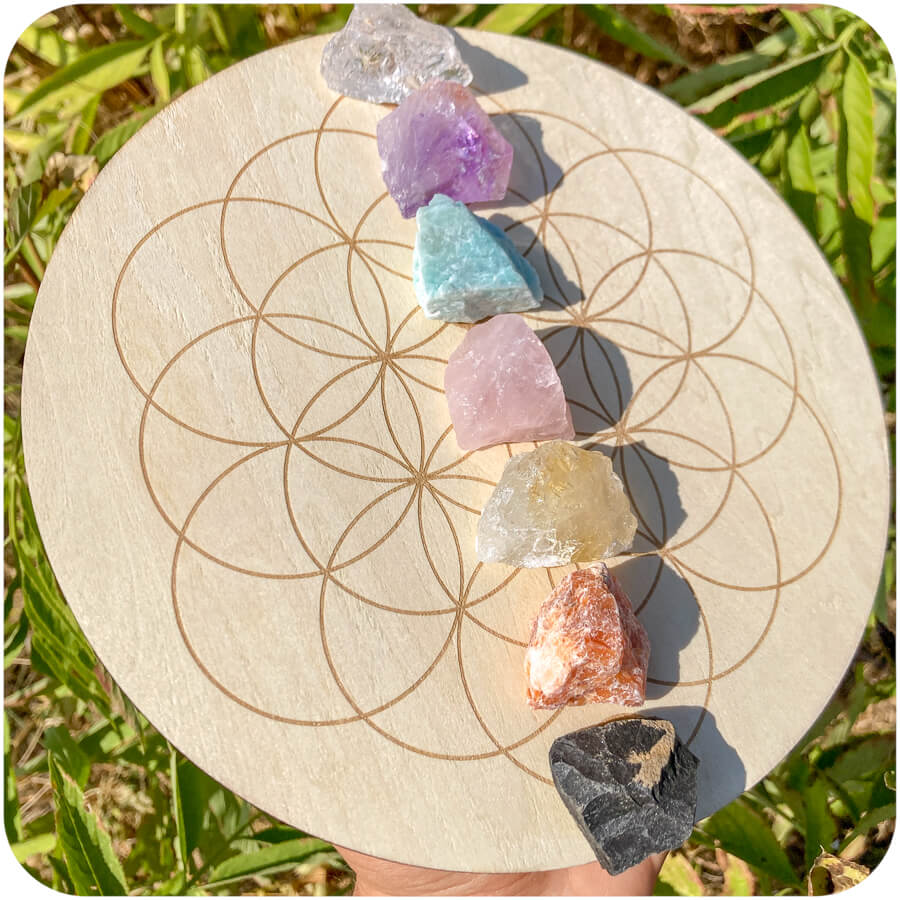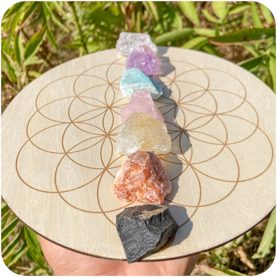 Set Pietre Brute pentru Cele Șapte Chakre cu Paletă Floarea Vieții